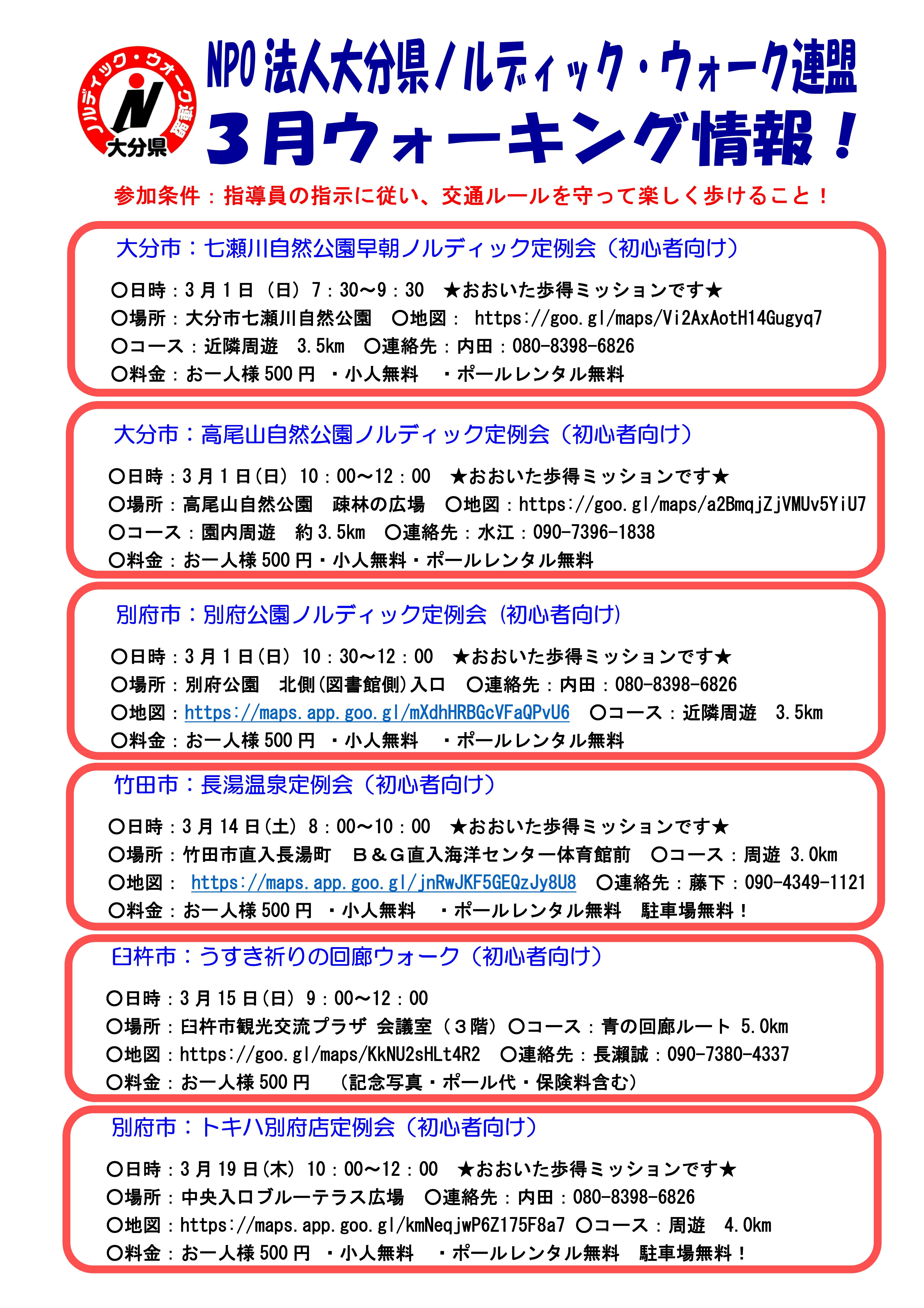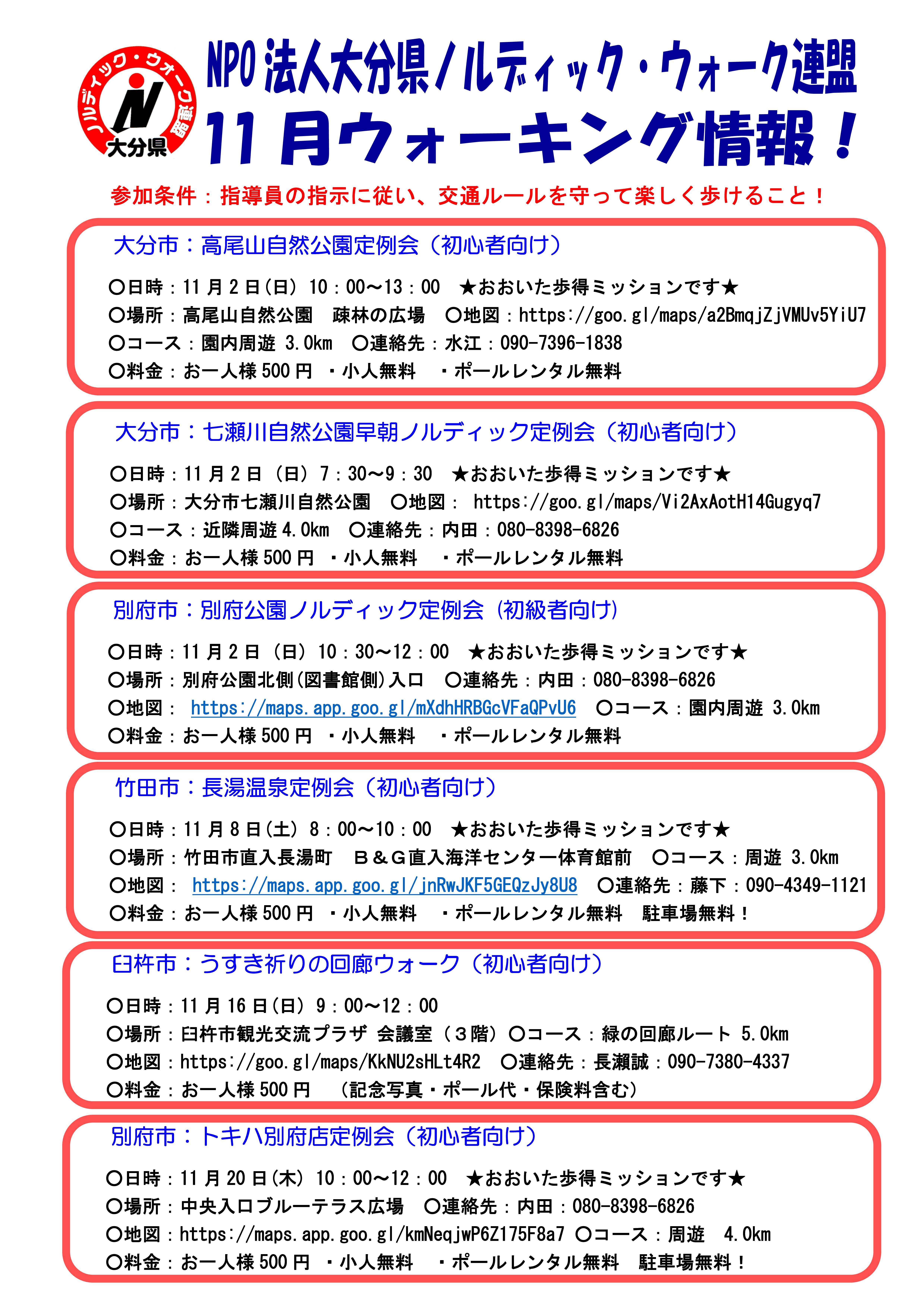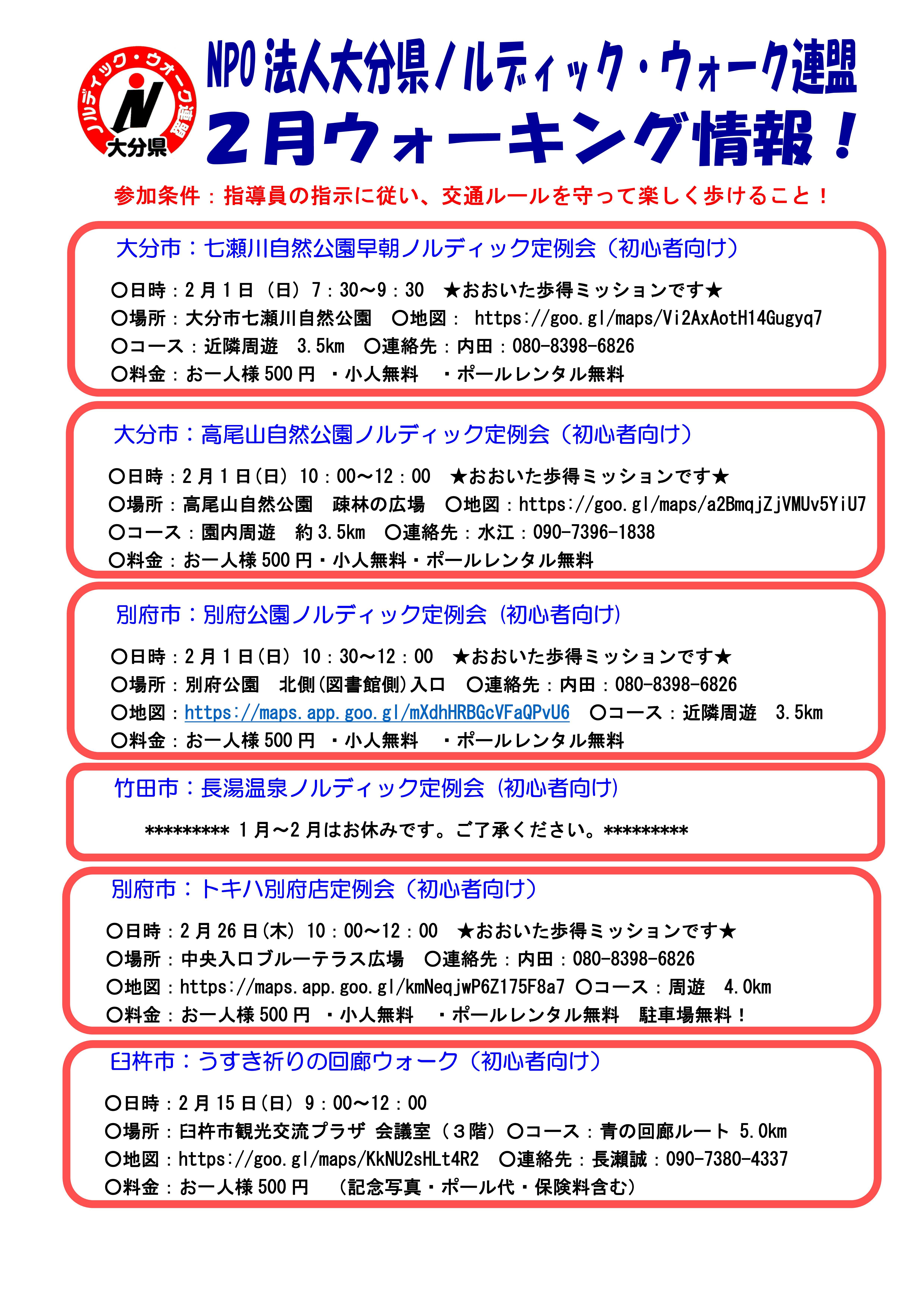 NPO法人 大分県ノルディック・ウォーク連盟では、これからノルディック・ウォークをはじめようとされる皆さんが気軽に参加できる「体験会」・「定例会」を開催しています。